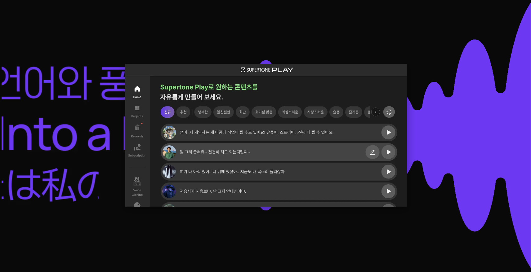 수퍼톤 플레이는 하이브 자회사이자 국내 AI 음성 기술 선도기업인 수퍼톤에서 개발한 TTS 서비스로, 무료 체험만으로도 놀라운 품질의 음성을 경험할 수 있습니다.